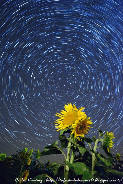 | Circumpolar Girasoles. Serie Noches en Soria. Apilado de 45 fotografías. f2.8 25″ ISO 6400. Software «Startrail» |