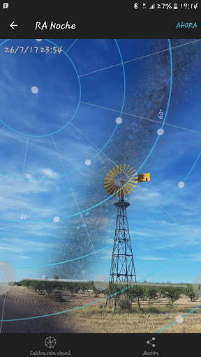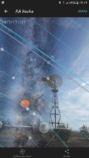 Existen aplicaciones de smartphone para poder planificar y «simular» la posición de la luna/sol, astros y vía láctea que resultan muy útiles. En esta ocasión utilicé la aplicación photopills, que entre otras funciones permite simular la posición del sol/luna o vía láctea con la cámara de nuestro smartphone en relación a nuestro sujeto (molino) y su evolución a través del tiempo que resulta visible.