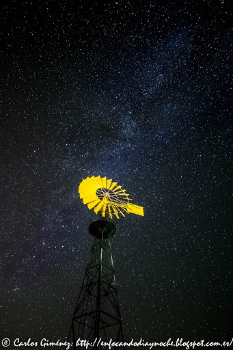 Como nos indica la aplicación, a esta hora y este día podríamos realizar esta composición para nuestra fotografía, mostrando el centro galáctico y el molino. En nuestro caso, como resultaba demasiado tarde /(01:57) ya que al día siguiente era día laboral, escogimos otra posible composición a una hora un poco más temprana y que nos llevo a fotografiar desde otra posición próxima, como muestra siguiente imagen.